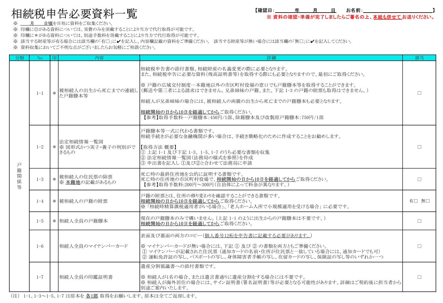 | 相続人全員のマイナンバーカードの両面コピー | 相続税申告書にマイナンバーを記載する必要があるため必要な書類 |
