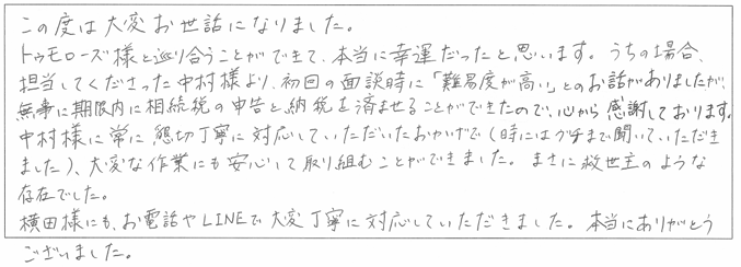 うちの場合、担当してくださった中村様より、初回の面談時に「難易度が高い」とのお話がありましたが、無事に期限内に相続税の申告と納税を済ませることができたので、心から感謝しております。