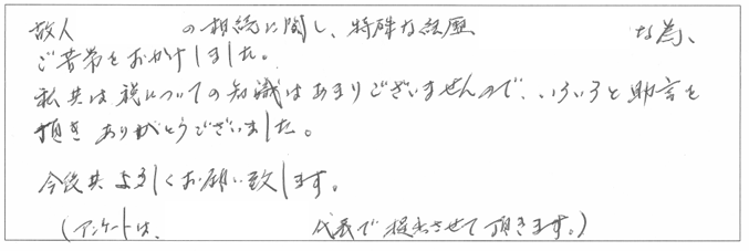 故人の相続に関し、特殊な経歴な為、ご苦労をおかけしました。
