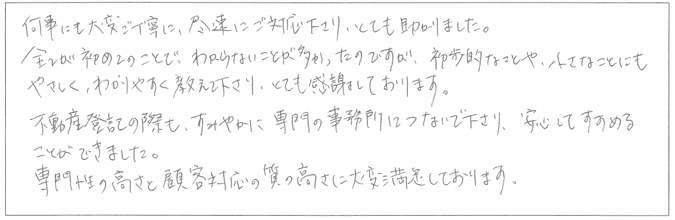 不動産登記の際も、すみやかに専門の事務所につないで下さり、安心してすすめることができました。