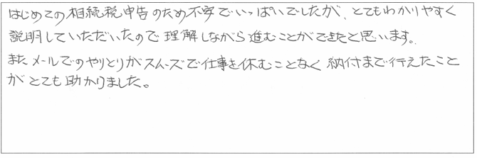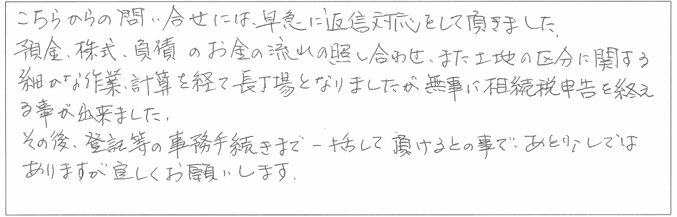 こちらの依頼が遅く、申告期限がせまっていましたが、ていねいに財産チェックをしてくださり、モレのないように申告していただきました。