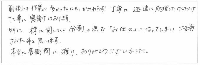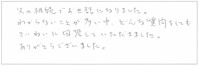 当初は想定していなかった相続手続きについても、その度に丁寧に対応していただきありがとうございました。