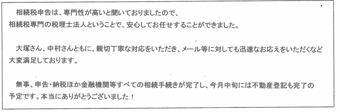 私どもの生活環境上、スピーディーな対応がとれず、岩田様には余裕を持って進めて戴く中、相続税納税期日も迫る当月納税となりましたが、最後までこちらの立場にご配慮下さり、暖かくサポートを下さいました。