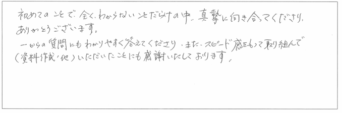 一からの質問にもわかりやすく答えてくださり、また、スピード感をもって取り組んで(資料作成他)いただいたことにも感謝いたしております。