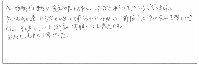 母の複雑すぎる遺産や資金移動をお手伝いいただき本当にありがとうございました。