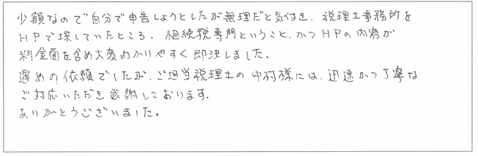 少額なので自分で申告しようとしたが無理だと気付き、税理士事務所をHPで探していたところ、相続税専門ということ、かつHPの内容が料金面を含め大変わかりやすく即決しました。