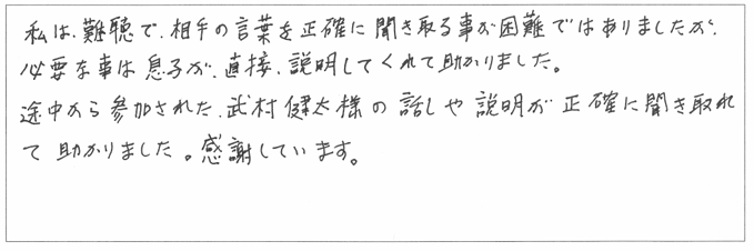 私は、難聴で、相手の言葉を正確に聞き取る事が困難ではありましたが、必要な事は息子が、直接、説明してくれて助かりました。