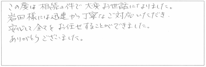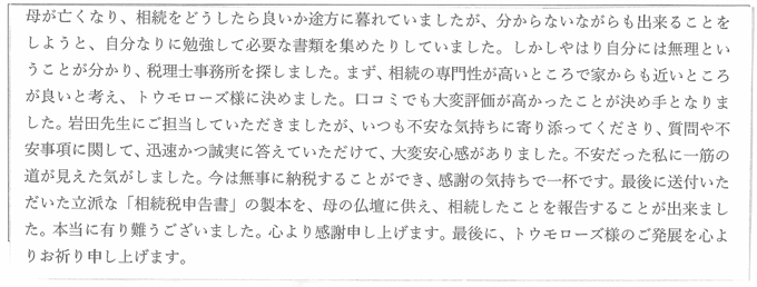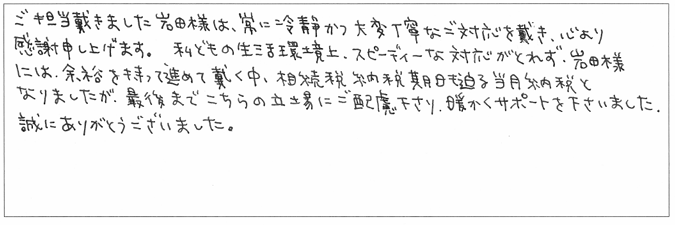 私どもの生活環境上、スピーディーな対応がとれず、岩田様には余裕を持って進めて戴く中、相続税納税期日も迫る当月納税となりましたが、最後までこちらの立場にご配慮下さり、暖かくサポートを下さいました。