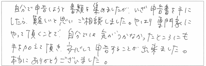 やはり専門家にやって頂くことで、自分では気がつかなかったところにも手を加えて頂き、安心して申告することが出来ました。