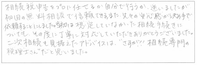 二次相続も見据えたアドバイスは、”さすが!!相続専門の税理士さん”だと思いました。