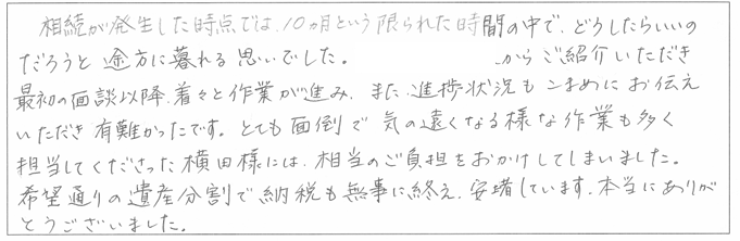 相続が発生した時点では、10ヶ月という限られた時間の中で、どうしたらいいのだろうと途方に暮れる思いでした。