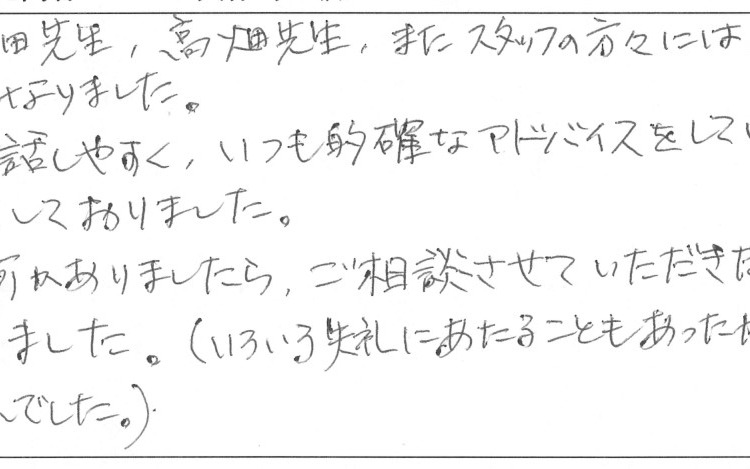 先生方はとても話しやすく、いつも的確なアドバイスをしていただくので、安心してお任せしておりました。