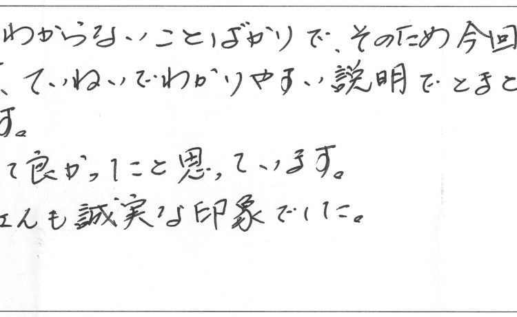 相続のことはわからないことばかりで、そのため今回依頼をいたしましたが、ていねいでわかりやすい説明でとまどうことはなかったです。