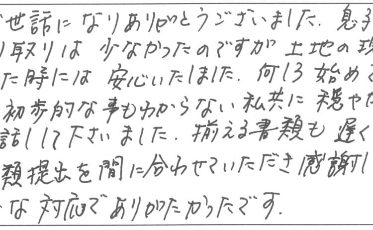 息子からの紹介だったので直接のやり取りは少なかったのですが、土地の現地調査でいらしていただいた時には安心いたしました。