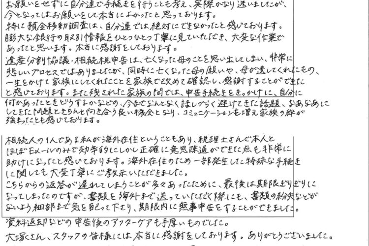 遺産分割協議・相続税申告は、亡くなった母のことを思い出してしまい、非常に悲しいプロセスではありましたが、同時に亡くなった母の願いや、母が遺してくれたもの、一生をかけて家族にしてくれたことを家族で改めて確認し、感謝することができたと感じております。