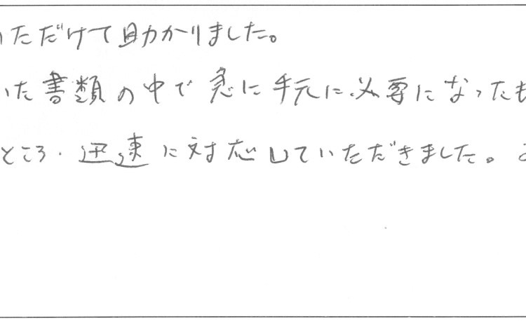 また、お預けしていた書類の中で急に手元に必要になったものがあり、先に送付をお願いしたところ、迅速に対応していただきました。ありがとうございます。