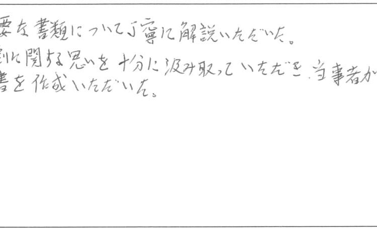 ・相続人の遺産分割に関する思いを十分に汲み取っていただき、当事者が納得のいく形で遺産分割協議書を作成いただいた。