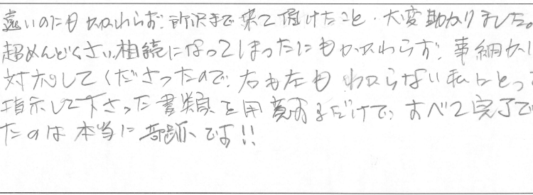 ➁超めんどくさい相続になってしまったにもかかわらず、事細かに対応してくださったので、右も左もわからない私にとって、指示して下さった書類を用意するだけで、すべて完了できたのは本当に奇跡です!!