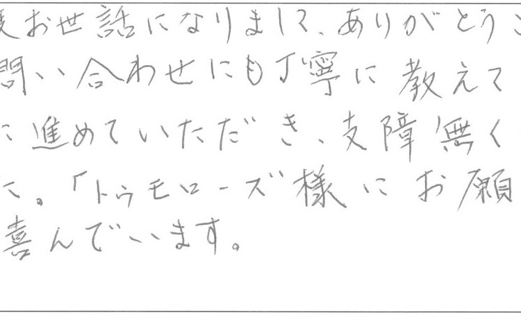 的はずれな問い合わせにも丁寧に教えていただき、支障無く手続きが終了しました。「トゥモローズ様にお願いして本当に良かった」と喜んでいます。