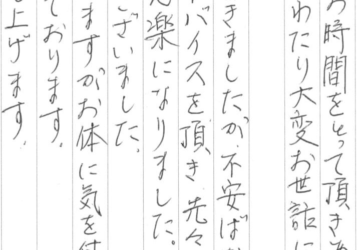 アンケートにも書きましたが、不安ばかりの中、ご親切に、又、ご丁寧にアドバイスを頂き、先々の心配も減って気持ちがずいぶん楽になりました。