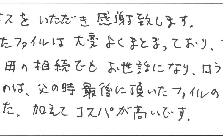 父に続いて母の相続でもお世話になり、口うるさい妹も賛成しましたのは、父の時最後に頂いたファイルの充実感の賜物と思いました。加えてコスパが高いです。