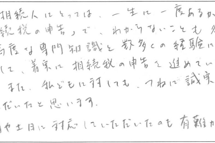 私ども相続人にとっては、一生に一度あるかないかという「相続税の申告」で、わからないことも多かったのですが、高度な専門知識と数多くの経験に基づき、専門家として、着実に相続税の申告を進めていただいたと思います。また、私どもに対しても、つねに誠実に丁寧に接していただいたと思います。