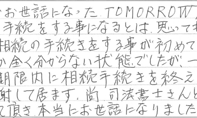 以前に娘がお世話になったTOMORROWSさんで、娘の相続の手続をする事になるとは思っても居なかった事で、何しろ相続の手続きをする事が初めての事で、何をどうして良いのか全く分からない状態でしたが、一から丁寧に説明して頂き、期限内に相続手続きを終える事が出来て大変感謝して居ます。尚、司法書士さんとの連携も大変スムーズにして頂き本当にお世話になりました。