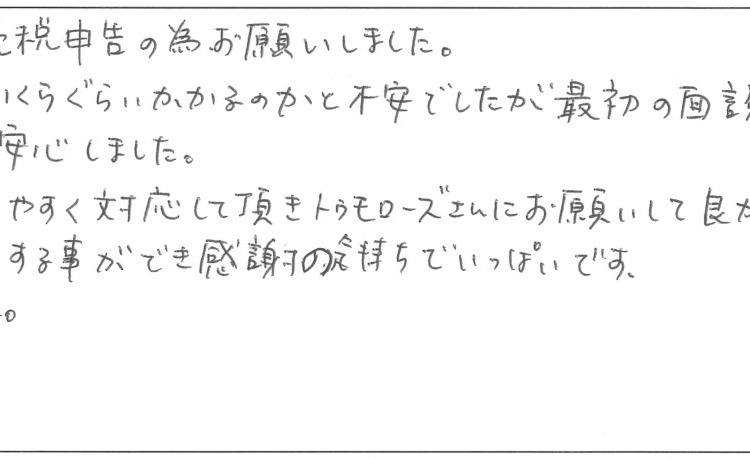 初めての相続でいくらぐらいかかるのかと不安でしたが最初の面談で大体の金額も出して頂きとても安心しました。