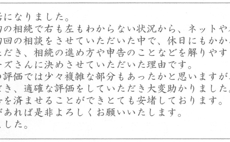 不動産(借地権)の評価では少々複雑な部分もあったかと思いますが、実際に現地まで赴いて調査していただき、適確な評価をしていただき大変助かりました。