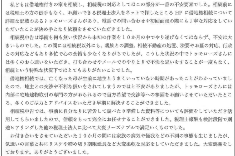 相続税申告は準備も何も無い状況から未知の作業を10か月の中でやり遂げなくてはならず、不安は大きいものでした。この間には相続税以外にも、親族との調整、相続不動産の処置、法要やお墓の対応、行政との対応などもあり多忙で心の余裕も少なくなりがちでしたが、こうした状況の中でトゥモローズさんには多くのお心遣いをいただき、打ち合わせやメールでのやりとりで不快な思いをすることが一度もなく、相続という特殊な状況下ではとてもありがたいことでした。
