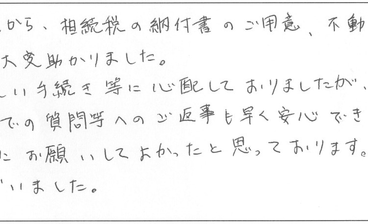 休日でのご相談から、相続税の納付書のご用意、不動産の売却までを手配して頂き、大変助かりました。