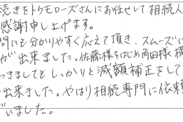 この度の相続手続をトゥモローズさんにお任せして相続人一同本当に良かったと心より感謝申し上げます。