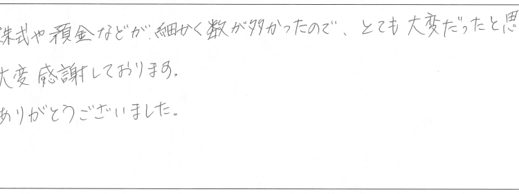 株式や預金などが細かく数が多かったので、とても大変だったと思います。
