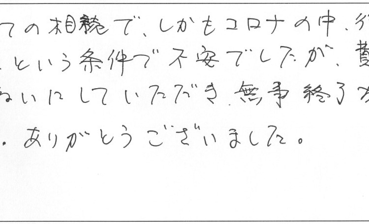 突然で初めての相続で、しかもコロナの中、行方不明の親せきがいるという条件で不安でしたが、費用や税金(延長)の説明を丁ねいにしていただき、無事終了することができ、安心しました。ありがとうございました。