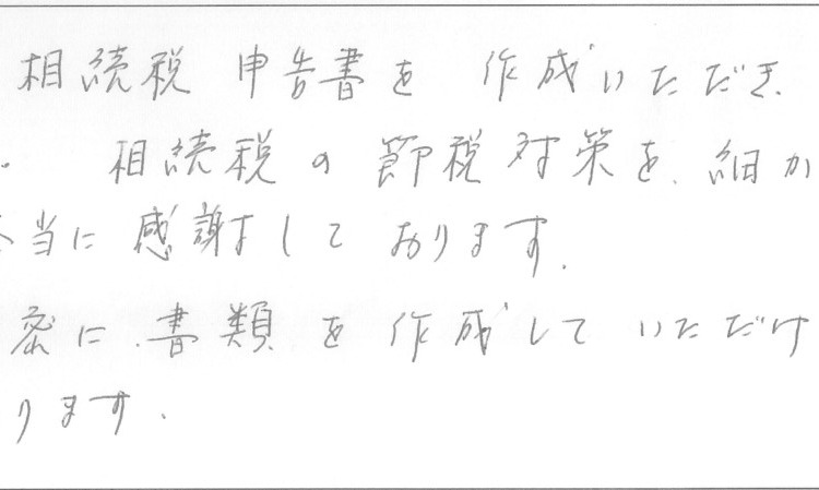 この度は、相続税申告書を作成いただき、誠に有難うございました。相続税の節税対策を、細かく考えていただき、本当に感謝しております。