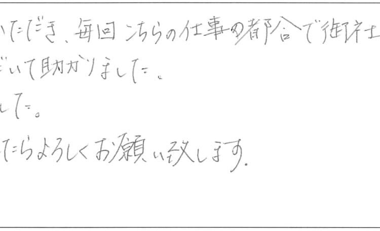 親身に対応していただき、毎回こちらの仕事の都合で御社に伺えず自宅に来ていただいて助かりました。