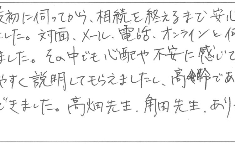 その中でも心配や不安に感じているところを素人にも分かりやすく説明してもらえましたし、高齢である母にも上手に伝えることができました。