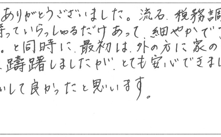 流石、税務調査率1%未満という実績を持っていらっしゃるだけあって、細やかで丁寧な作業に驚かされました。