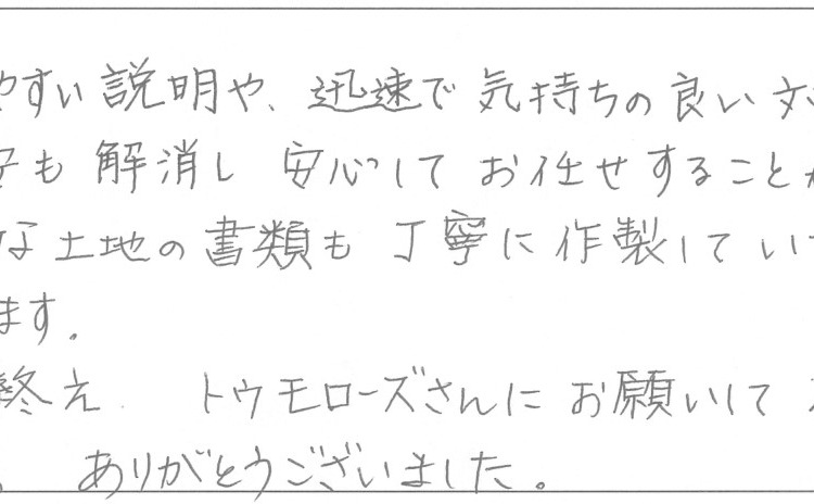 大量で煩雑な土地の書類も丁寧に作製していただき感謝しております。