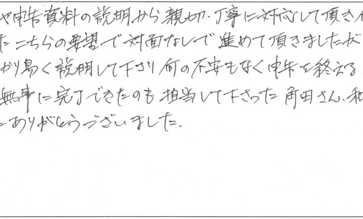 またこちらの要望で対面なしで進めて頂きましたが疑問や財産の報告もその都度、電話で分かり易く説明してくださり何の不安もなく申告を終えることができました。