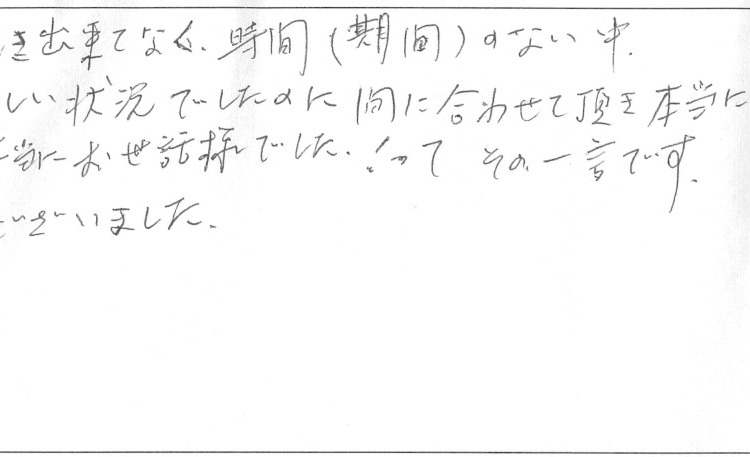 何もわからず手続き出来てなく、時間(期間)のない中、大変厳しい状況でしたのに間に合わせて頂き本当に感謝しかございません。