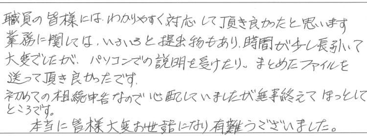 初めての相続申告なので心配していましたが無事終えてほっとしているところです。
