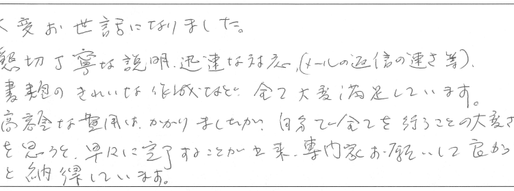 大変お世話になりました。懇切丁寧な説明、迅速な対応(メールの返信の速さ等)、書類のきれいな作成など、全て大変満足しています。高額な費用はかかりましたが、自分で全てを行うことの大変さを思うと、早々に完了することが出来、専門家お願いして良かったと納得しています。