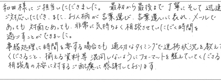 (1)和田様にご担当いただきました。最初から最後まで丁寧にそして迅速にご対応いただき、また、お人柄が言葉選び言葉遣いに表れ、メールであっても対面であっても非常に気持ちよく相談させていただく時間を過ごすことができました。