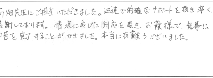 高畑先生にご担当いただきました。迅速で的確なサポートを頂き深く感謝しております。情況に応じた対応を頂き、お蔭様で無事に申告を完了することができました。本当に有難うございました。