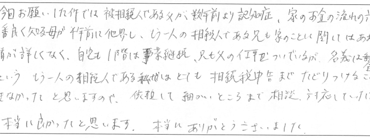 今回お願いした件では被相続人である父が数年前より認知症、家のお金の流れの詳細を一番良く知る母が4年前に他界し、もう一人の相続人である兄も家のことに関してはあまり事情が詳しくなく、自宅も1階は事業継続、兄も父の仕事をついでいるが、名義は全て父という、もう一人の相続人である私ではとても相続税申告までたどりつけることができなかったと思いますので、依頼して細かいところまで相談、対応していただいて本当に良かったと思います。本当にありがとうございました。