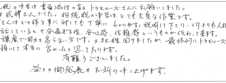 担当は武村さんでした。相続税の申告はとても大変な作業です。武村さんはどの様な事に対しても丁寧にわかりやすく説明して下さり、何よりも人柄です。彼と話していると十分過ぎる位、安心感、信頼感というものが伝わって来ます。