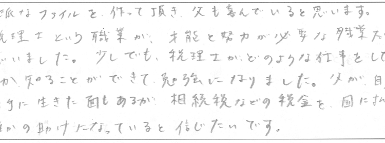 税理士という職業が、才能と努力が必要な職業だと思いました。少しでも、税理士がどのような仕事をしているのか、知ることができて勉強になりました。父が自分勝手に生きた面もあるが、相続税などの税金を、国に払い、誰かの助けになっていると信じたいです。