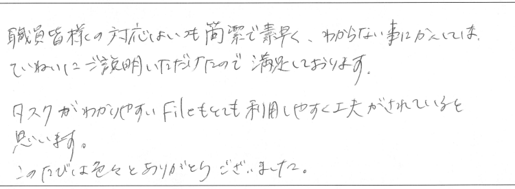 職員皆様の対応はいつも簡潔で素早く、わからない事にかんしては、ていねいにご説明いただけたので満足しております。