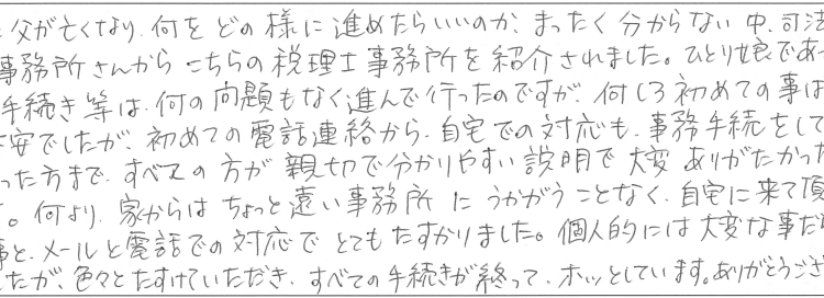 急に父が亡くなり、何をどの様に進めたらいいのか、まったく分からない中、司法書士事務所さんからこちらの税理士事務所を紹介されました。ひとり娘であった為、手続き等は、何の問題もなく進んで行ったのですが、何しろ初めての事ばかりで不安でしたが、初めての電話連絡から、自宅での対応も事務手続をして下さった方まで、すべての方が親切で分かりやすい説明で大変ありがたかったです。何より、家からはちょっと遠い事務所にうかがうことなく自宅に来て頂けた事と、メールと電話での対応でとてもたすかりました。個人的には大変な事だらけでしたが、色々とたすけていただき、すべての手続きが終って、ホッとしています。ありがとうございました。